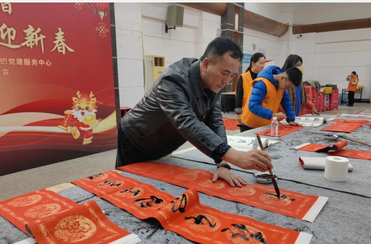 连日来,黄江镇“两新”组织党员志愿者、党员书法爱好者分别在田美社区广场会堂、中信红树山小区、碧桂园小区、裕元工业园区等开展“迎新春、送祝福”活动。党员书法爱好者挥毫泼墨,将一副副春联送至现场群众手中。活动现场还设有福“照”全家拍摄活动,为党员群众免费拍摄冲印全家福照片。