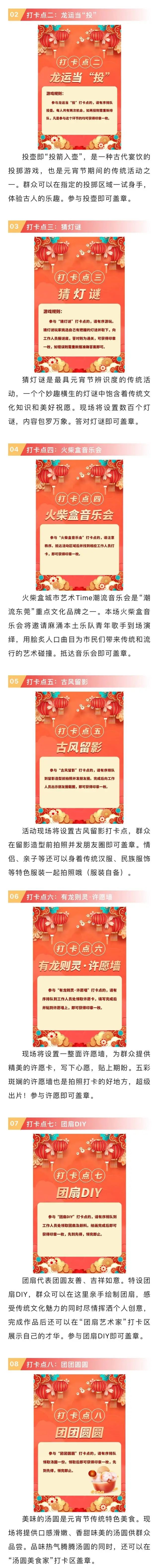 现场将开展火柴盒潮流音乐会、赏花灯,大家也可以参与投壶、猜灯谜、绘团扇、品汤圆,还有许愿墙、古风留影等活动。市民参与活动的同时还可以在打卡点收集精美的“龙宝”主题印章,集齐全部8个印章即可兑换精美礼品。
