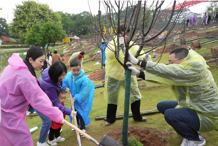 植树现场,尽管天气较冷,阴雨绵绵,大家依然热情高涨。来自不同民族、不同党派的人们分工合作,有的挥锄挖土,有的扶苗培土,有的提桶浇水,还不时交流植树造林、美化环境、保护生态的想法、体会。在大家的共同努力下,一棵棵象征民族团结和生态文明的广州樱稳稳地扎根土壤,为龙湾湿地公园增添了一抹抹新绿。