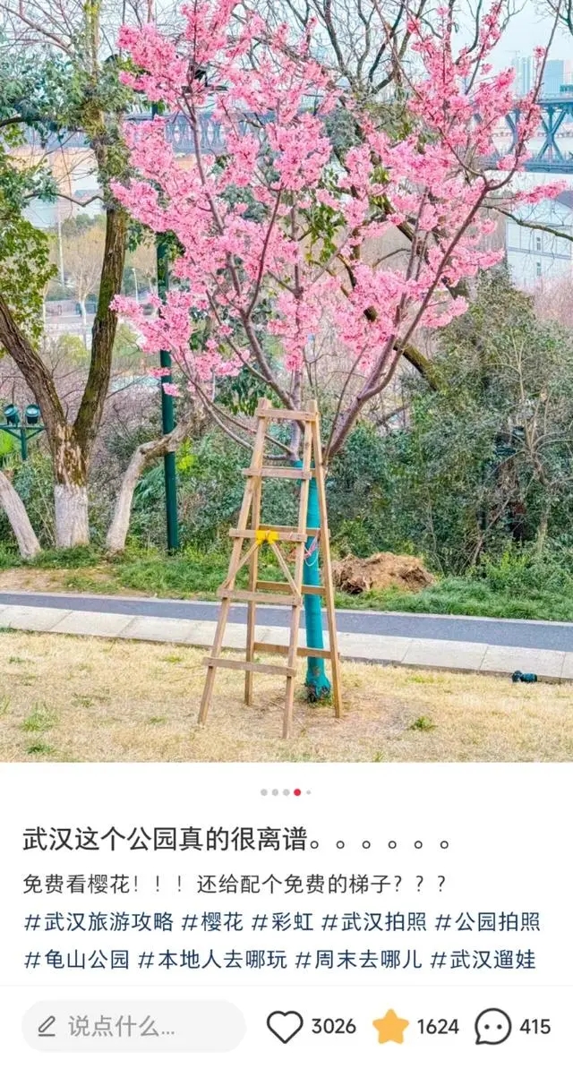 3月,春风送暖,武汉多地樱花陆续开放,吸引不少市民游客前来赏花。近日,一则关于龟山公园为游客提供梯子赏樱的帖子引起网友讨论,不少人表示质疑,认为此举可能妨碍他人文明赏花,并对樱花树造成不良影响。