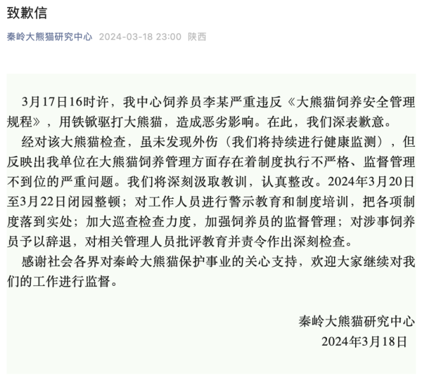 3月17日16时许,我中心饲养员李某严重违反《大熊猫饲养安全管理规程》,用铁锨驱打大熊猫,造成恶劣影响。在此,我们深表歉意。