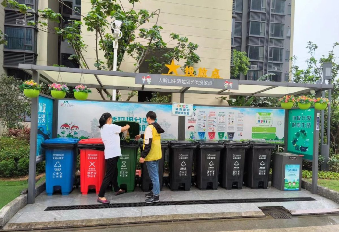 以设施规范化建设为着力点,大岭山镇因地制宜设置了规范化分类投放点156个,其中万科·金域缇香、松湖碧桂园天钻等3个小区共配置引导员11名。在松湖碧桂园天钻内,记者看到,垃圾分类投放亭内设有清晰的生活垃圾分类投放指引,各类垃圾的清运处理去向公示明确,还配有便民洗手盆、照明等设施。据一旁的引导员刘阿姨介绍,该分类亭采用定时分类投放的方式,小区内还特别设置了误时投放点,方便部分错过投放时间的居民扔垃圾。