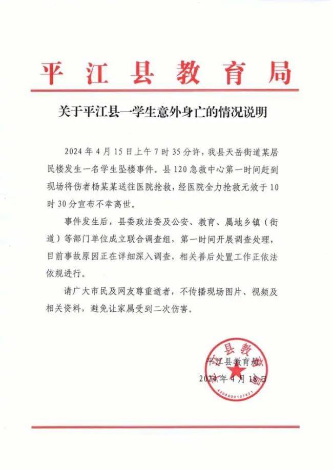 4月18日晚,平江县教育局发布情况说明,表示已成立联合调查组,对晨晨坠楼事件展开详细深入调查,同时依法依规进行善后处理。杨先生悲痛欲绝:“我心如刀割,无法用语言形容。孩子至今未能入土为安,我不知他有何等勇气选择轻生,我宁愿随他而去,陪他在冰冷的殡仪馆。”