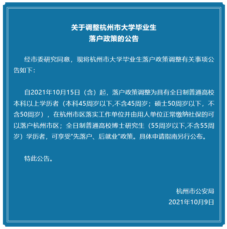 10月9日,“杭州公安”微信公众号发布关于调整杭州市大学毕业生落户政策的公告。全文如下: