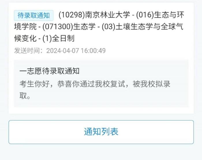 目前,程同学成功上岸了南京林业大学。去参加复试时,看到了自己向往了四年的“梦中情校”的樱花。“以前听人说最美不过金陵夜樱,现在亲眼看到了,我觉得自己没做错选择。”在程同学的脑海里,南京、樱花、梦校这三个形象已经融为了一个对于梦想、追求的整体意象,是支撑着她在困难中继续前行的动力。