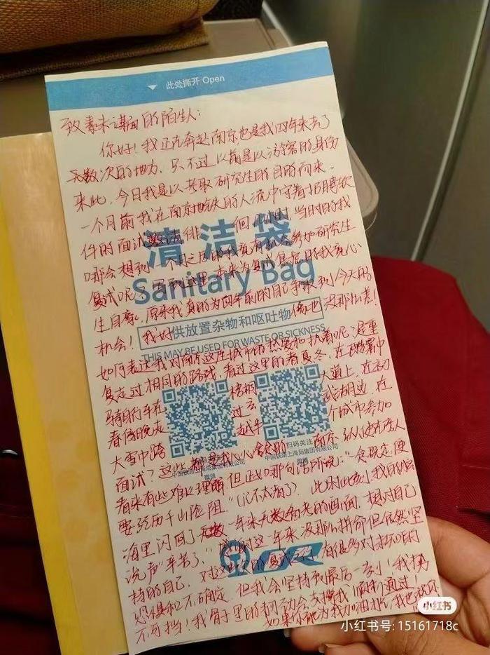 机缘巧合的是,在清洁袋上留言的乐乐(化名)也刷到了该内容。“当时我本来想搜复试题,结果主页第一条就是一片红的清洁袋,点开之后发现就是我写的那份,很震惊,简直像做梦一样。”乐乐当天乘坐的列车是从上午11点到晚上9点的,尽管她在袋子上写了大段祝福,但她以为这份留言的宿命就是被清理,没想到不仅没被清理,第二天还被同样赶复试的朋友收到。