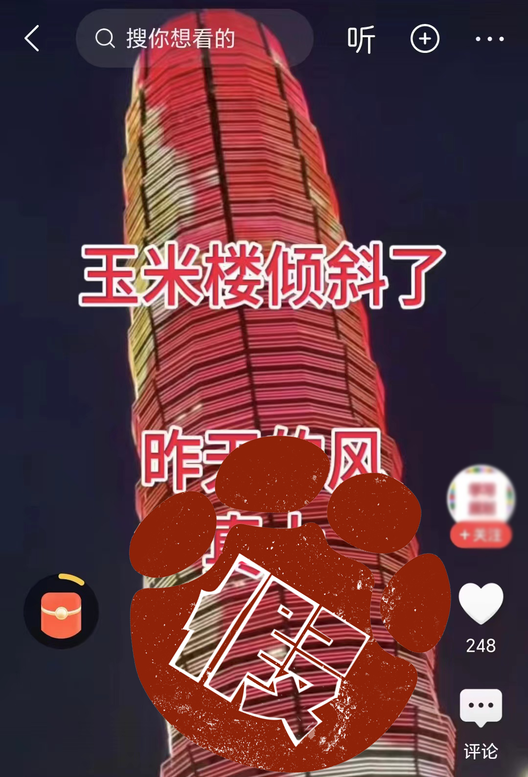 郑州“大玉米”楼被昨天的大风刮倾斜了?5月14日晚,郑州市遭遇强风天气侵袭。5月15日,有网友在网上发布视频称,郑州“大玉米”楼被大风刮的倾斜了。作为郑州的地标建筑,“大玉米”楼是否真的因大风而倾斜,一时间引起了市民和网友的广泛关注。对此,记者进行了采访核实。作为管理方迅速作出回应,明确表示此消息纯属谣言,“大玉米”楼并未因风力影响而发生倾斜。