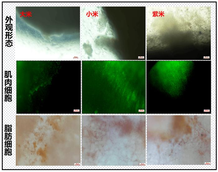 鸡肉米、猪肉米产品显微结构图(中国肉类食品综合研究中心、北京食品科学研究院供图) 大米是我国一日三餐常见的主食,小米和紫米是我国食用量较大的、具有独特营养价值的传统食材,而细胞培育肉技术获取的是肌肉的蛋白及脂肪。江南大学教授周景文认为,鸡肉米、猪肉米是细胞培育肉研究方向的一个新探索,是细胞培育肉多元化应用场景的一种展现,随着技术的进步,我国在细胞培育肉方面的研究步伐还会进一步加快。
