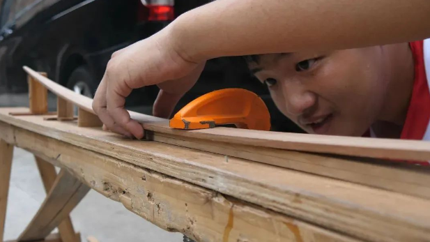 开料、刨木、拼装、扎绳、打磨、上油……别人的暑假都在玩,魏永豪却每天对着木头和其他龙舟模型潜心钻研,最终总结出制作龙舟模型的完整工序。他把周末和节假日拼拼凑凑,历时半年时间,一条128厘米的龙舟模型诞生了。