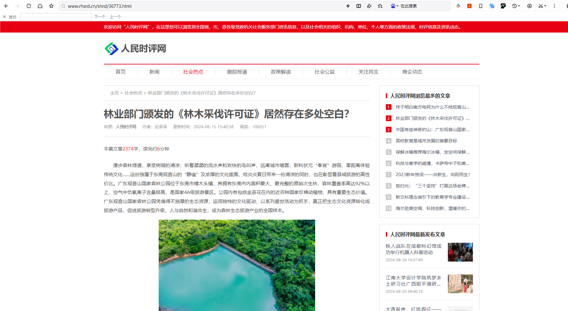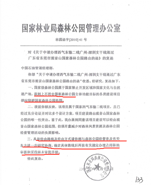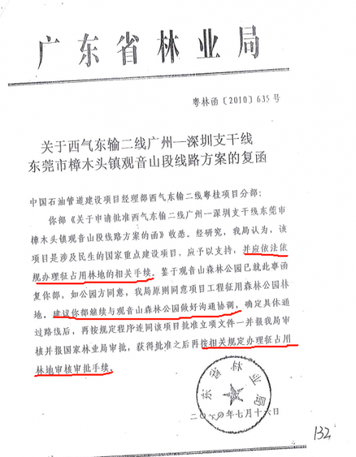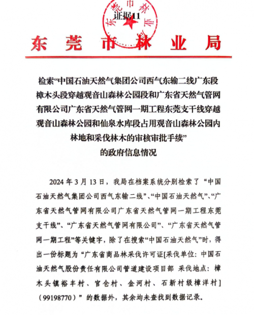 另外,观音山公园开发公司于2024年3月曾向东莞市林业局申请公开“西气东输穿越观音山公园段占用公园内林地和采伐林木的审批手续”,市林业局回复,除了找到一份《广东省商品林采伐许可证》外,并未搜索到其他任何审批手续文件,即西气东输工程占用观音山森林公园林地并未经过林业局审批,这是违法占用林地行为。