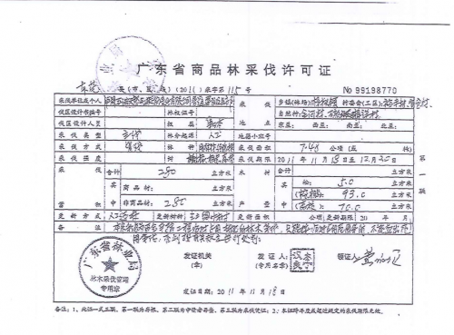 再次,东莞市林业局在该《广东省商品林采伐许可证》上面填写的内容多处不实,并且存在多处空白,许可证的内容不合法。根据《广东省林业局关于林木采伐的管理办法》第十六条审核发放采伐许可证时,发证机关及其工作人员必须遵守下列规定:(一)采伐许可证上填写的采伐内容应当符合有关采伐技术规程的规定,不得漏填、涂改项目和虚开采伐数量。东莞市林业局颁发的《广东省商品林采伐许可证》中,林权证号,采伐地址的四至,采伐强度,更新面积、更新期限等等多栏处存在空白,其中采伐地址的四至居然都是空白,那就意味着施工单位随便砍伐,想砍伐哪个地方的树木就砍伐哪个地方的树木,这显然是不允许的。因此东莞市林业局在该《广东省商品林采伐许可证》内容不合法,应该予以撤销。
