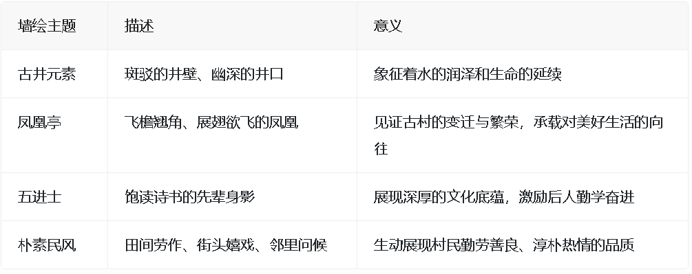墙绘内容紧紧围绕迳联古村落的特色,其中古井元素的墙绘诉说着村民取水担水的故事,象征着水的润泽和生命的延续。凤凰亭的墙绘则栩栩如生,展现了古村的变迁与繁荣,承载着村民对美好生活的向往。五进士的画面则展现了迳联深厚的文化底蕴,激励着后人勤学奋进,传承文化薪火。此外,描绘朴素民风生活的墙绘则生动展现了迳联村民勤劳善良、淳朴热情的品质。