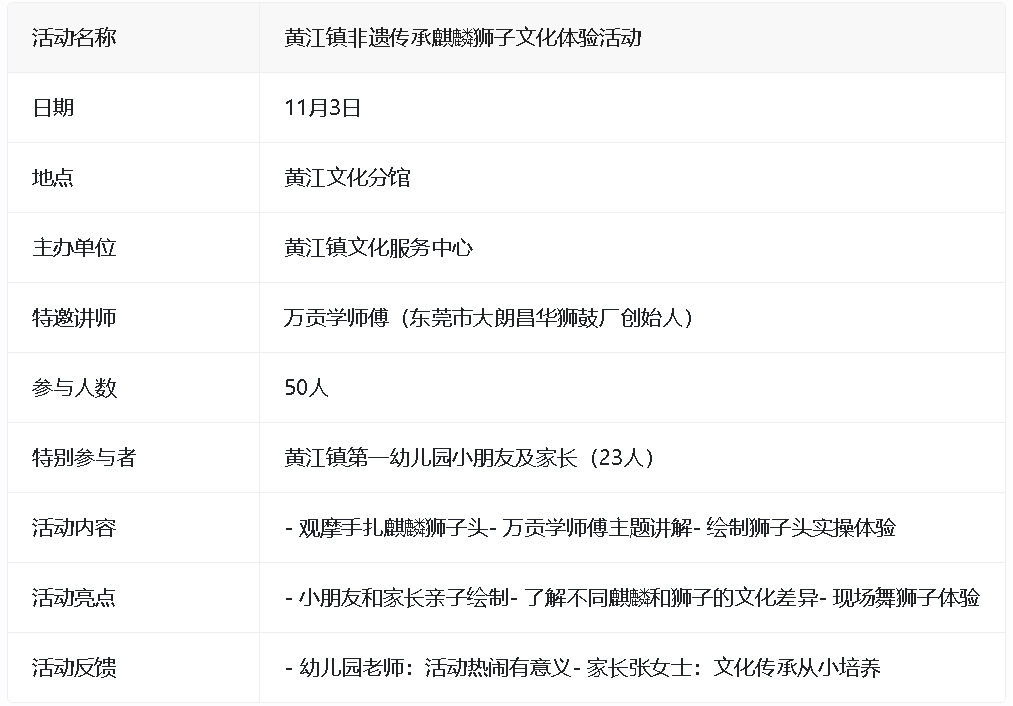 表格:黄江镇非遗传承麒麟狮子文化体验活动概览