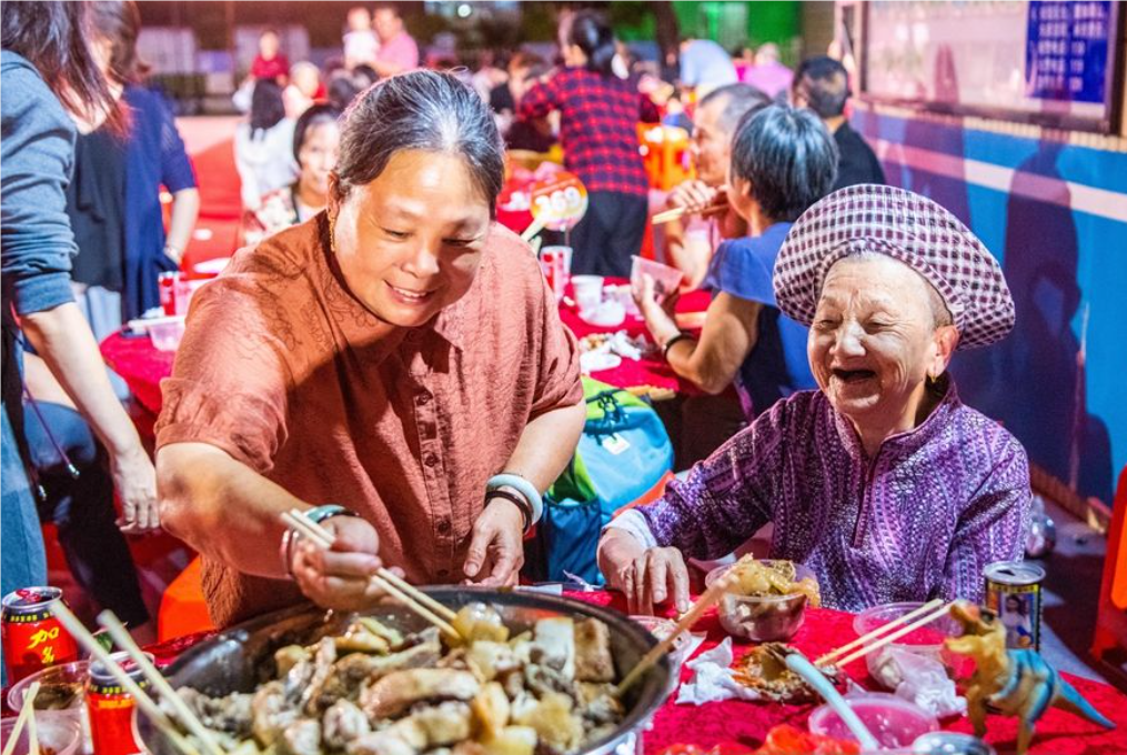 晚宴现场,盆菜宴整齐排列,热气腾腾,香气四溢。居民朋友们围坐在一起,品尝着寓意团圆美满的盆菜佳肴,长者们精神矍铄,共叙趣事,享受着温馨有爱的团聚时光。