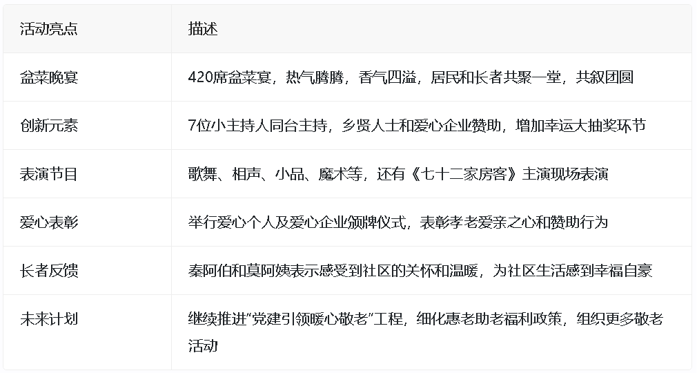 长者们对晚宴好评如潮,秦阿伯表示,晚宴不仅有盆菜宴和各种演出,还有抽奖活动,充分感受到社区的关怀和温暖。莫阿姨则表示,这样的活动不仅让他们老年人感受到团聚的氛围和欢乐,更让他们感受到社区对长者的关爱,为生活在这样的社区而感到幸福、自豪。