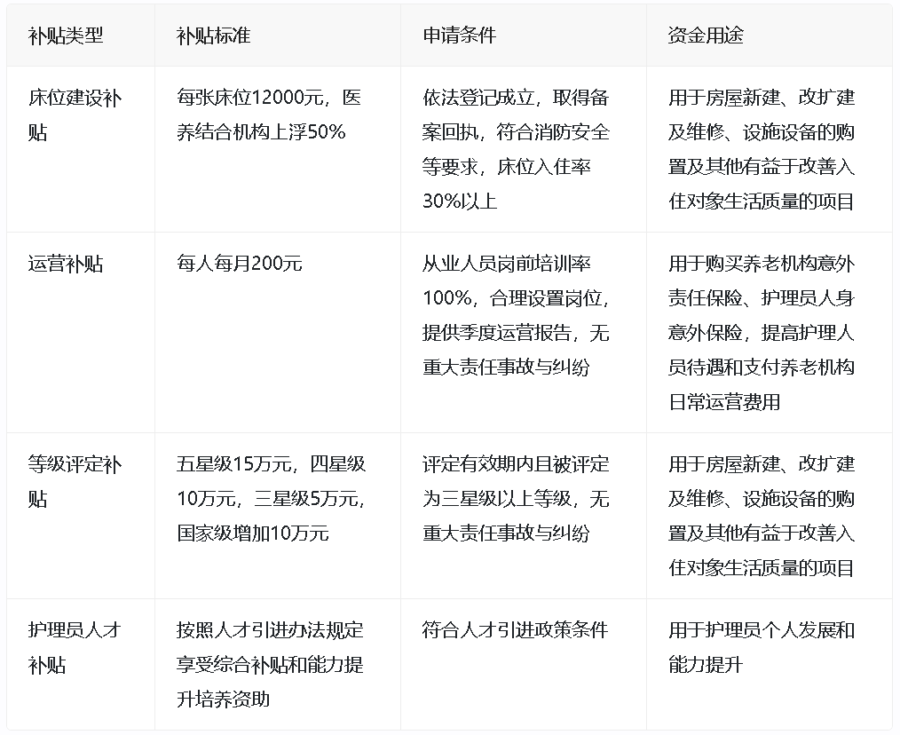 - 补贴对象:评定有效期内且被评定为三星级以上等级的养老机构。