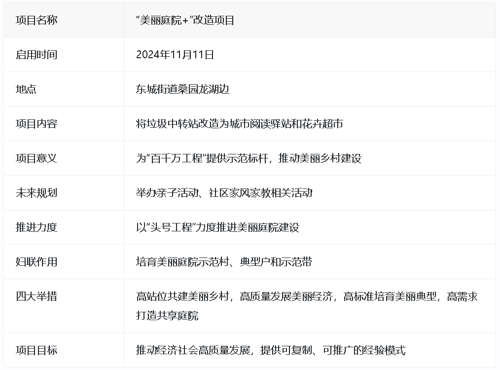 龙湖边的“美丽庭院+”项目是东城街道“百千万工程”的重要组成部分。通过创新性的改造,原本的垃圾中转站被转变为兼具文化与经济效益的城市阅读驿站和花卉超市。这一改造项目深度融合了“美丽庭院”与“美丽经济”“花卉超市”“社会力量”等元素,结合“妈妈岗”“玉兰妈妈志愿服务”以及“愉阅书屋”等创新举措,不断赋予“美丽庭院”新的内涵,绘制了一幅美丽庭院、美丽经济、美好生活共融共生的乡村新画卷。