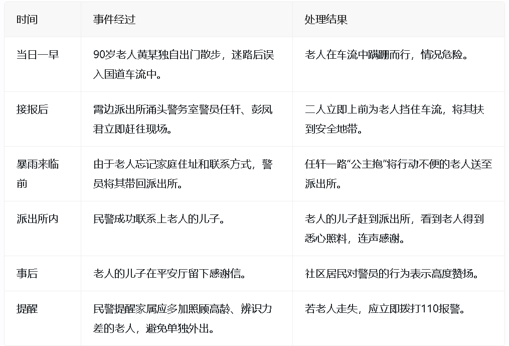 由于老人无法回忆起家庭住址和联系方式,加上当时突然下起了暴雨,任轩和彭凤君决定先将老人带回派出所。在回派出所的过程中,考虑到老人行动不便,任轩一路以“公主抱”的方式将老人送至派出所,确保其安全。