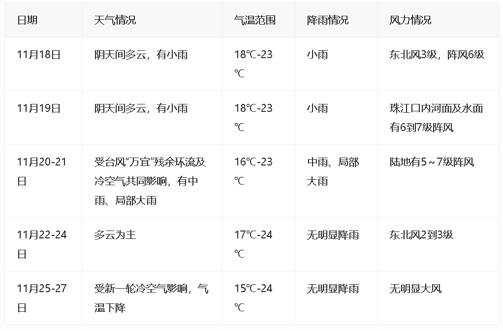 - 19日:受冷空气和台风“万宜”影响,阴天间多云,有小雨,气温18℃-23℃。