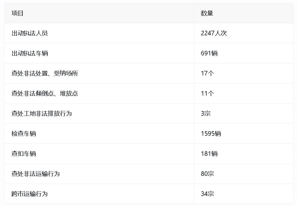 - 查处情况:共出动执法人员671人次、执法车辆219辆,查处非法处置、受纳场所4个,非法倾倒点、堆放点5个,工地非法排放行为1宗。