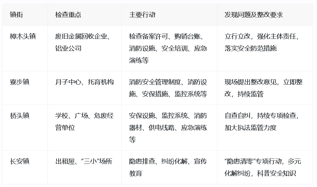 为确保年终岁尾期间人民群众的生命财产安全,东莞市多个镇街积极响应市政府号召,结合本地实际情况,制定了一系列实施方案,并开展了多项安全生产检查和隐患排除行动。这些行动旨在从源头上消除各类风险隐患,盯紧重点领域和薄弱环节,持续推进隐患排查工作,切实保障社会安全稳定。