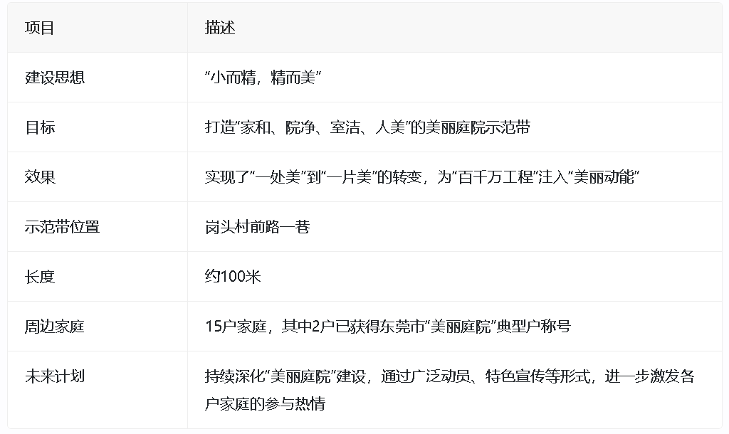 该示范带位于岗头村前路一巷,长约100米。周边有15户家庭,其中2户家庭已获得东莞市“美丽庭院”典型户称号。岗头村妇联主席朱礼欢表示,接下来将持续深化“美丽庭院”建设,通过广泛动员、特色宣传等形式,进一步激发各户家庭的参与热情,推动“百千万工程”落地见效。