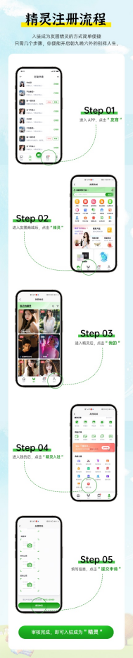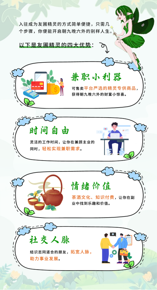 注册成为友圃精灵,在朝九晚六之外,跳出一层不变的日常人际圈,边玩边赚,开启一段全新的社交旅程,在社交娱乐中实现兼职副业需求。