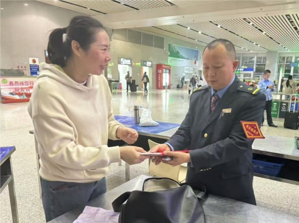 当天19:20,刘双发在安检查危处发现一个女士黑色单肩包,内有现金12000元及价值45万元的收货凭据对账单。他立即通过车站广播寻找失主,并利用对账单上的手机号码等信息进行核对。在确认失主身份后,刘双发将遗失物品交还,失主连声感谢,并随后致电广铁客服热线12306表达谢意。