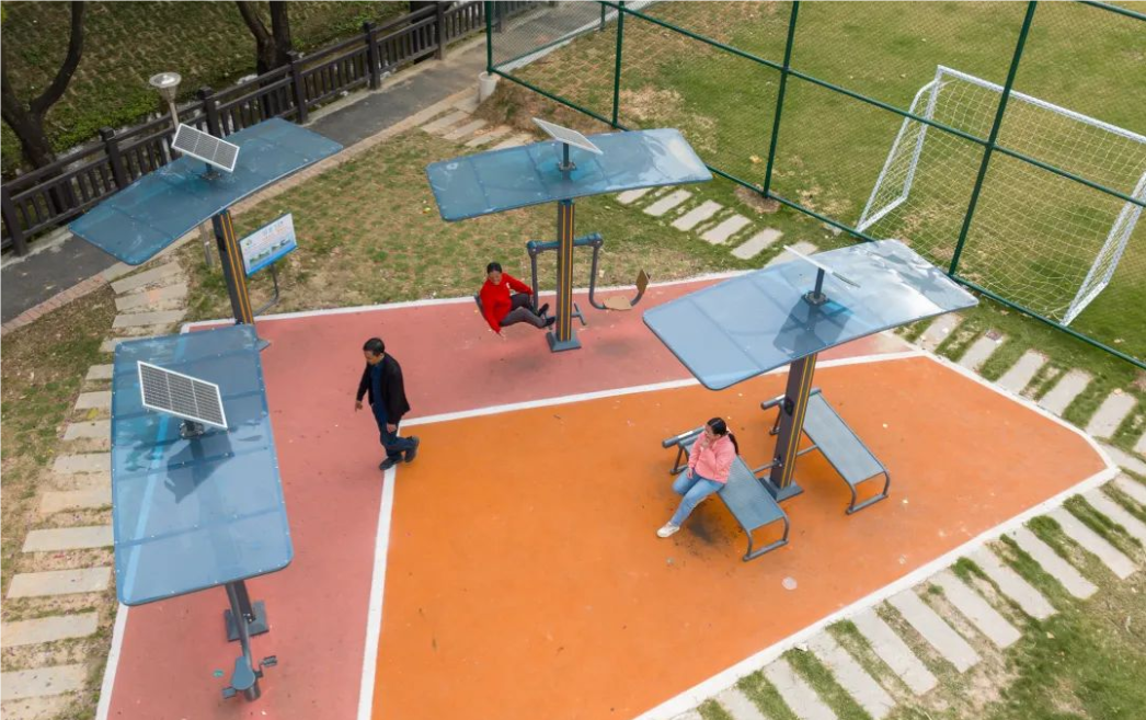 公园内新增设了智能健身路径、五人制笼式足球场、健身步道等多元化健身设施,吸引了不同年龄层的村民积极参与体育锻炼。新安装的智能健身器材位于遮雨棚下,每套器材上都清晰标明了产品名称、主要功能和锻炼方法。器材顶部的太阳能板为其提供了独立的供电系统,确保市民在任何天气条件下都能舒适、安全地运动,这使得公园成为了一个备受欢迎的免费户外“健身房”。紧挨着健身区的五人足球场也进行了全面改建,四周设置了崭新的围网,为居民提供了一个舒适、安全的运动环境。这些改造显著提升了公园的运动环境,进一步增强了居民的运动健身体验。