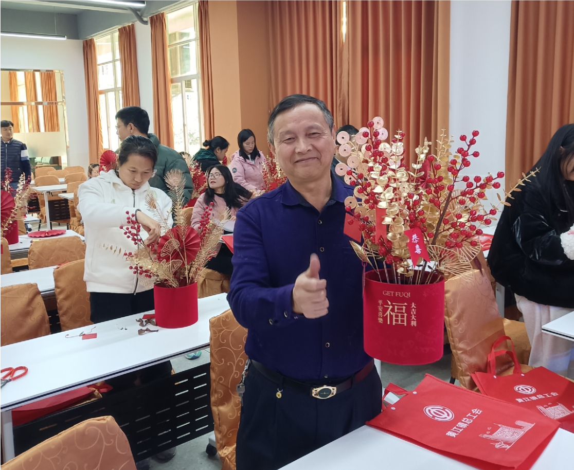 与此同时,社工还开展了职工需求调研活动,通过发放问卷和现场交流的方式,深入了解企业工会主席和职工在文体娱乐、权益维护等方面的需求和期望。职工们积极参与,畅所欲言,工会社工将对收集到的需求进行认真分析和总结,以便为职工提供更贴心、更优质的服务。参与活动的职工表示:“今天工会开展的DIY福桶活动非常有意义,自己动手做的福桶感觉把福气都装进里面,特别有新春佳节的仪式感。”此次福桶DIY活动不仅让职工们感受到了浓浓的节日氛围,还增强了职工之间的凝聚力和向心力。新的一年里,黄江工会、先锋号职工服务中心将根据职工需求不断改进和完善,与职工共同创造更加美好的未来。