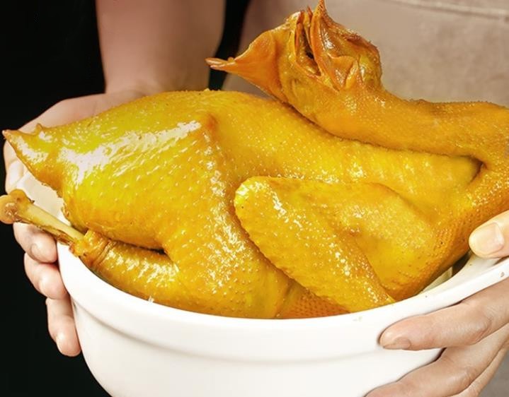 ① 鸡洗净擦干,用盐焗粉涂抹内外,腌制1小时(鸡肚子塞姜片);