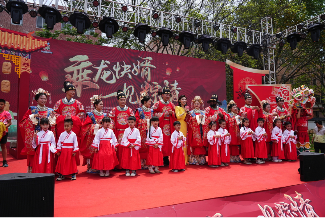 5月11日,厚德河畔上演跨越时空的文化碰撞。六对新人乘龙舟破浪,以滘水为媒,在岭南水乡的现代演绎中完成生命契约,这场融合国际元素的集体婚礼既重现明清时期"以船为轿"的婚俗传统,更展现东莞作为移民城市的文化包容力。锣鼓声里,美国教师Ben与白俄罗斯教师Kate身着锦绣红袍完成三拜礼,成为这场文化实验最生动的注脚。