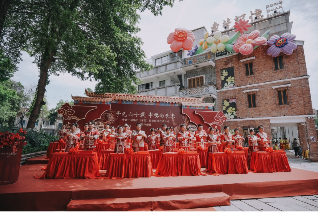 在粤港澳大湾区建设热潮中,一场别开生面的企业人文实践引发行业关注。5月11日,中建三局东莞记忆项目工地褪去机械轰鸣,16对建筑新人以百年骑楼为媒,在青砖灰瓦间完成中式婚典。这场由东莞市总工会指导、企业全额出资打造的"争先六十载幸福向未来"主题婚礼,折射出央企在新时代对"幸福空间"的深层诠释。