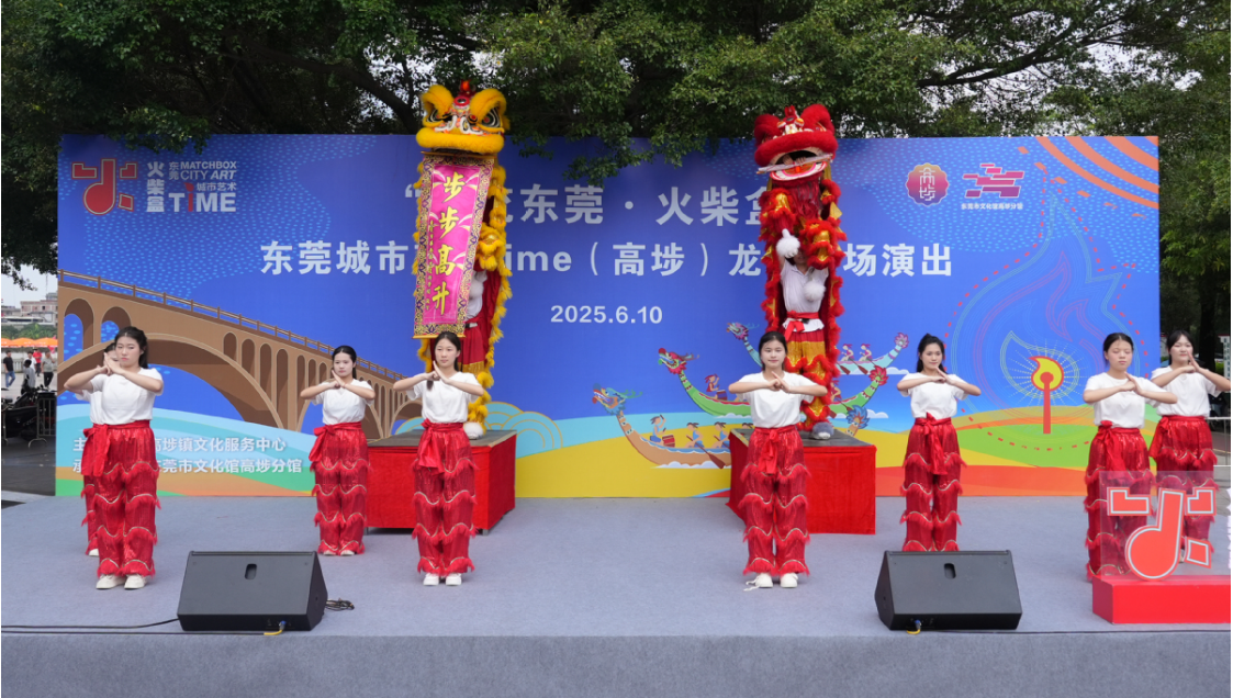 82岁的新联村刘伯扶着栏杆的手微微发颤,老人被太阳晒得黝黑的胳膊上,深褐色老茧仍清晰可见。"这是十八岁扒龙舟留下的勋章。"他指着江面飞驰的船队对孙辈说。此刻的东江两岸,年轻父母把孩子扛在肩头,手机镜头与专业相机组成第二道观赛线。更引人注目的是江岸舞台——身着香云纱的舞者刚演绎完水乡祭祀舞,街舞团队便踩着电子乐节拍腾空翻转,这场名为"潮流东莞·火柴盒"的现代艺术表演,让龙舟锣鼓与电音贝斯完成跨时空对话。