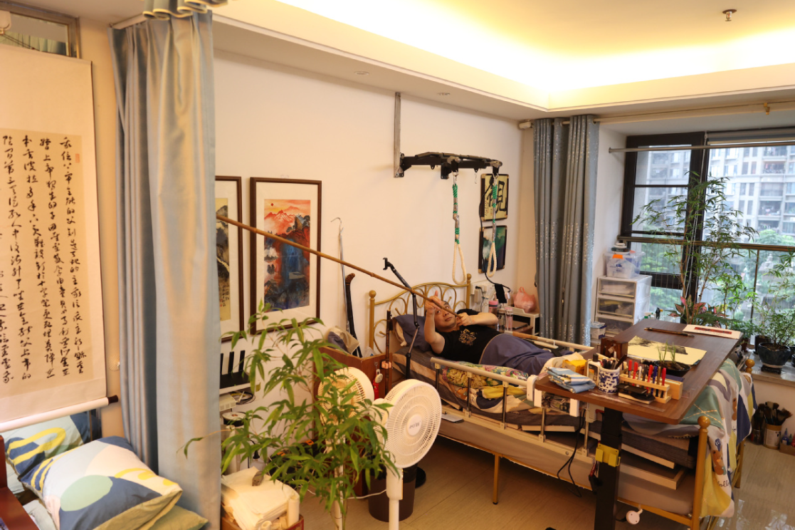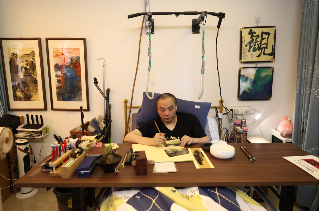 柳鑫的食指与中指夹着狼毫笔,橡皮筋在指节勒出深痕。墨锋触纸的刹那,太行山崖的皴法从肩胛骨传导至笔尖——这位胸椎以下永陷沉寂的退伍军人,正用颈椎的摆动幅度控制焦墨浓淡。当晨光穿透东莞南城静默堂的窗棂,未完成的《万壑松风图》在轮椅上投下嶙峋投影,恰似他二十三年病榻生涯的精神脊梁。