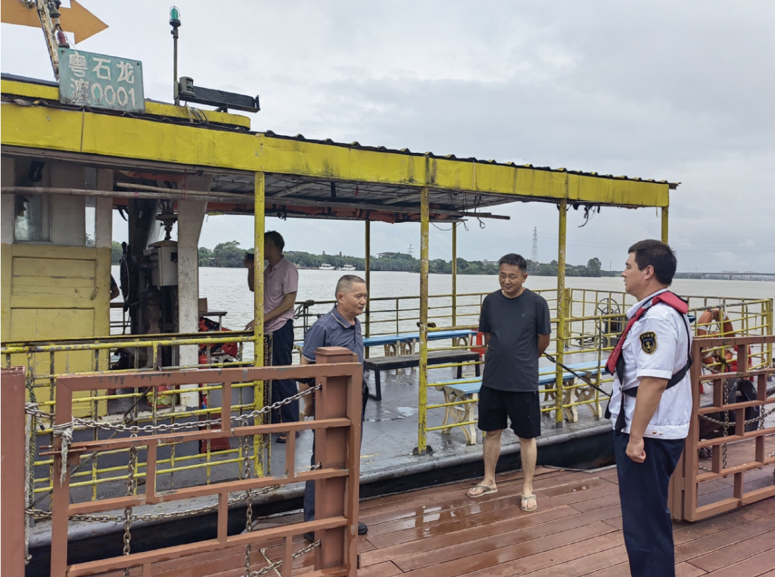 在防台措施落实方面,东莞沙田海事处对东莞港集装箱船舶和立沙岛危险化学品船舶进行了点验和安全宣贯,督促码头和船方加强协同,提前做好航次计划和防台安全措施。东莞石龙海事处则联合石排镇交通分局,在鲤鱼洲渡口开展了现场检查,提醒渡船密切关注水位变化和台风动态,严格落实特殊天气下的渡运措施。
