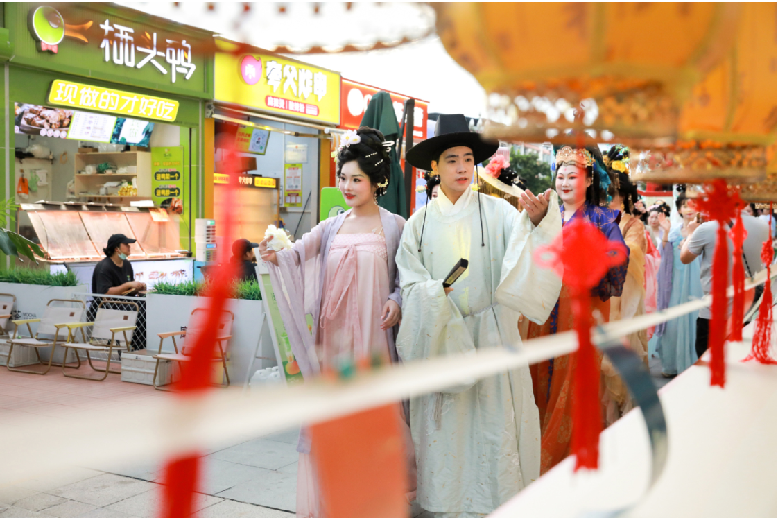 现场的国风汉服巡游、国风民乐团表演掀起当天活动的高潮。悠扬的民乐伴着雅致的汉服巡游,吸引大量市民驻足围观,并争相用镜头记录下古今交汇的精彩画面。