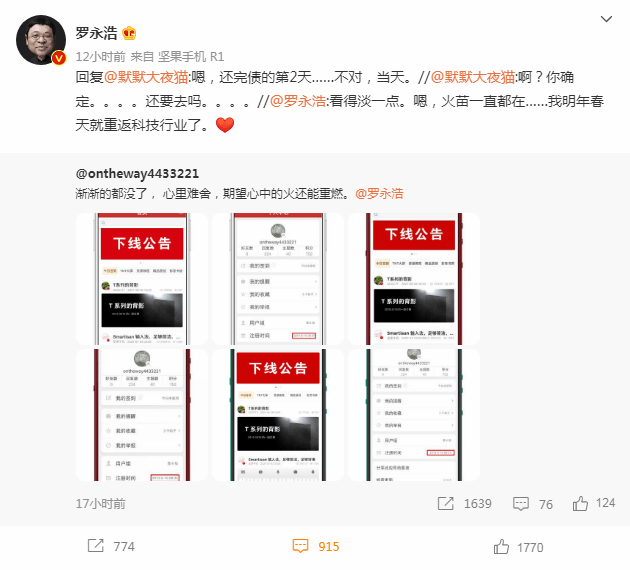 驱动中国2021年10月20日消息,近日,Smartisan OS官方发布了《关于锤子论坛下线的公告》。对此,有网友向罗永浩表示,渐渐的都没了,心里难舍,期望心中的火还能重燃。罗永浩回应称,明年春天就重返科技行业了,而且是还完债的当天就会回去。