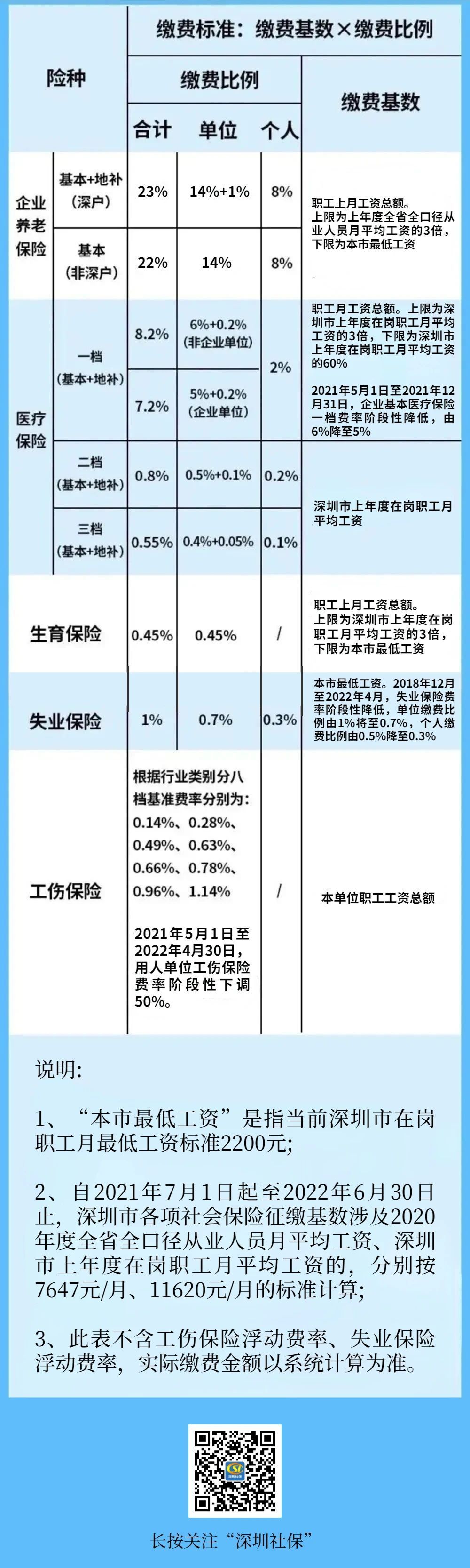 失业保险方面,缴费基数没有变化,仍然是深圳市最低月工资标准2200元,缴费比例为1%,其中单位比例0.7%,个人比例0.3%,也就是说个人每月需要缴纳失业保险费6.6元。记者获悉,2018年12月至2022年4月,我市失业保险费率阶段性降低,单位缴费比例由1%将至0.7%,个人缴费比例由0.5%降至0.37%。