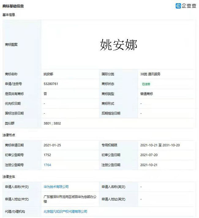 原标题:华为申请“姚安娜”商标获批