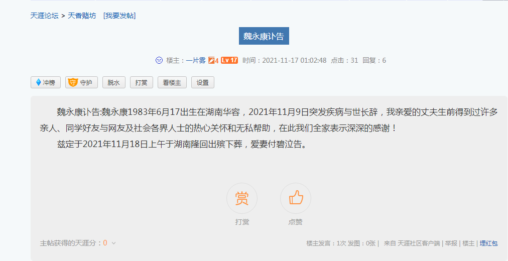 11月17日凌晨,付碧在天涯论坛发布讣告,称魏永康突发疾病逝世,感谢曾经得到过的帮助。同日上午11点17分,付碧发布回帖:“我再也见不到你的笑容了……”配图是魏永康与女儿的生活照。