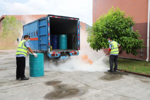 当天的应急演练模拟一辆具有危险品运输资质的厢式货车,装载涂料用稀释剂在厂区内卸货过程中,因溶剂包装桶一处开裂,易燃液体渗出的突发事故。