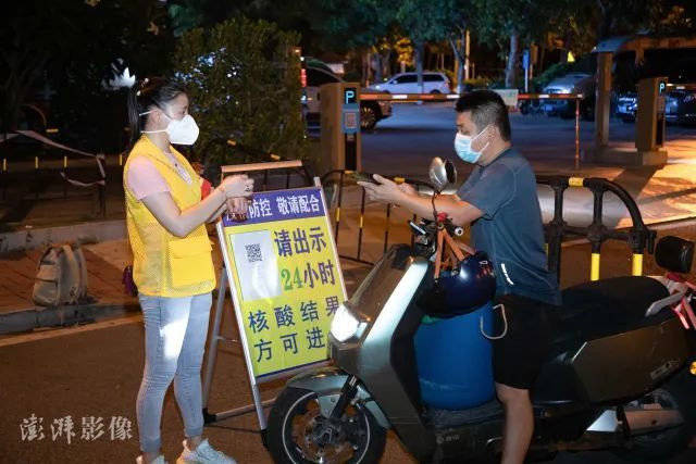 8月4日,三亚,志愿者对进入小区的市民查验核酸检测结果。