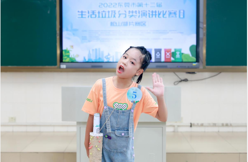 “垃圾不是危害物,它们其实是放错了地方的资源!”有趣的垃圾分类知识搭配着熟练的手势,7岁的陈紫伊为大家带来了别具特色的演讲,气场十足。陈紫伊妈妈介绍,孩子十分热爱演讲,东莞施行垃圾分类好几年了,希望让孩子通过比赛了解垃圾分类。