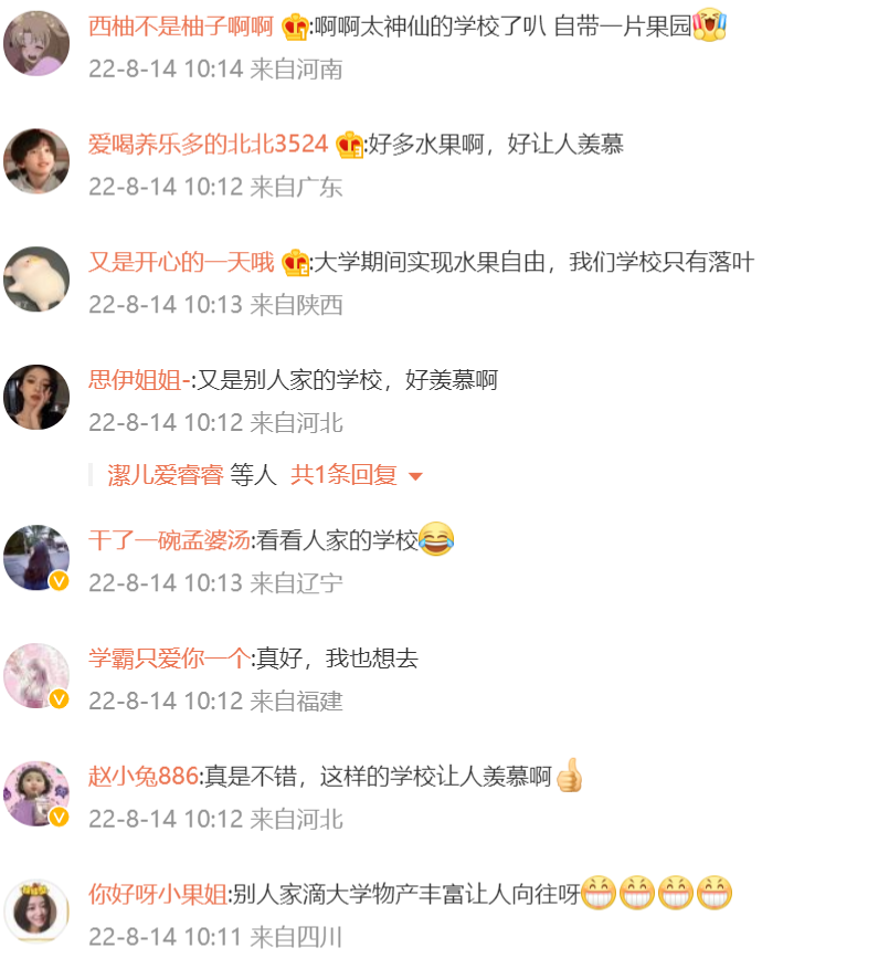 学生陶陶称,学校没有刻意种水果,因为地理位置非常适合生长水果,机缘巧合下就长了这么多水果,大概有十几种,而且学校不反对学生摘水果,注意安全就可以。网友们纷纷表示是本人的梦中情校了!