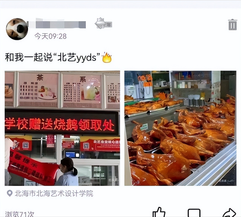 @茗茶1213:广西一高校是北海艺术设计学院,他们还发过烧鸡和烧鸭、荔枝、月饼、粽子、馒头。