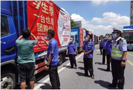 上午11时许,交警、城管部门在长堤路镇口综合市场段发现有违规流动广告车车队在沿路做广告宣传,遂对车队实施拦截。民警发现,现场的流动广告车均是大货车,车身外悬挂着广告海报以及设置了高音喇叭,10辆车沿路成一字型排开,在路面上缓慢行驶,一边行驶还一边使用高音喇叭播放广告录音,影响道路交通安全的同时,还对周边居民造成噪音困扰。