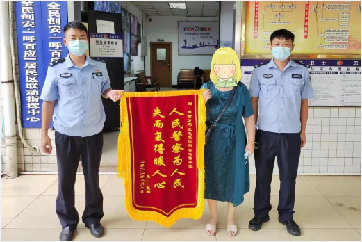8月12日,市民张女士来到三屯派出所将一面印有“人民警察为人民,失而复得暖人心”的锦旗送到警长方树容手中,对警务人员热心帮助自己找回腰包表示感谢。