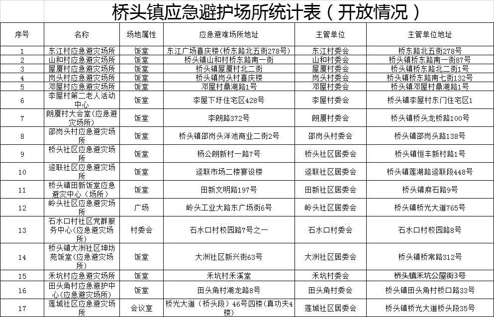 为切实保障人民群众生命财产安全,及时为危险区域群众提供应急避护,桥头开放镇内17个应急避护场所,为有需要的困难群众提供24小时应急避护。(东莞+)