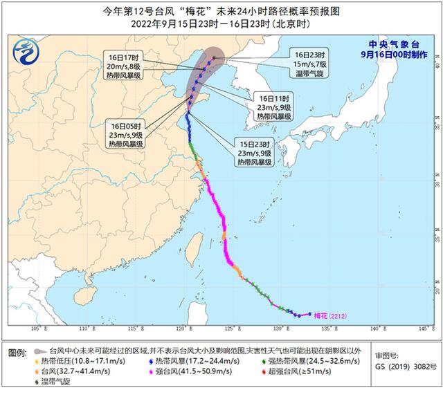 据中央气象台监测,16日0时前后,“梅花”的中心在山东青岛市崂山区沿海登陆,登陆时强度为热带风暴级,登陆时中心附近最大风力为9级(23米/秒),成为1949年以来登陆山东最晚的台风。